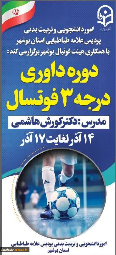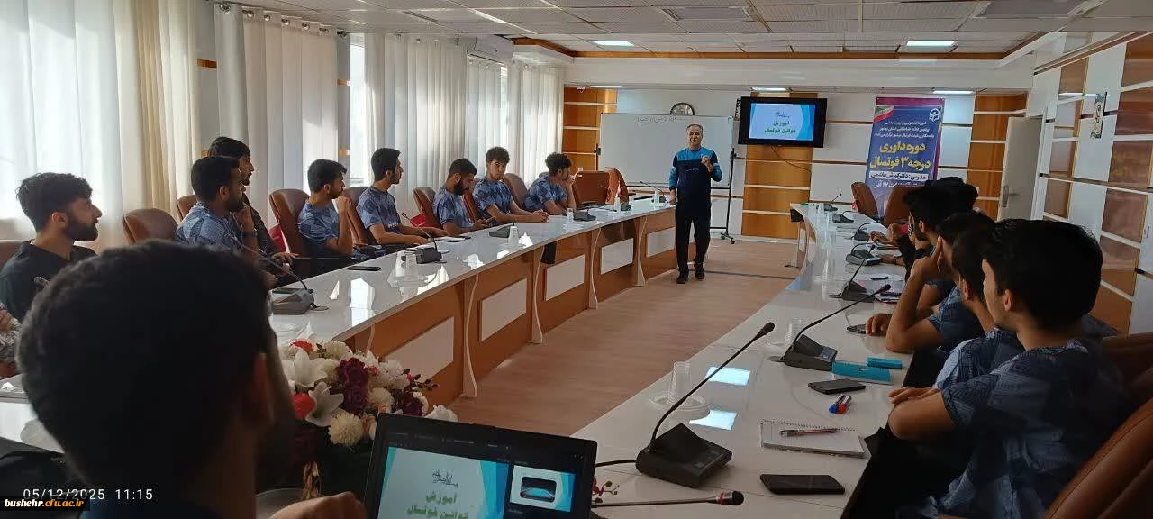 دوره داوری فوتسال درجه 3 در پردیس علامه طباطبایی بوشهر با حضور کورش هاشمی مدرس بین المللی فدراسیون فوتبال آغاز شد.